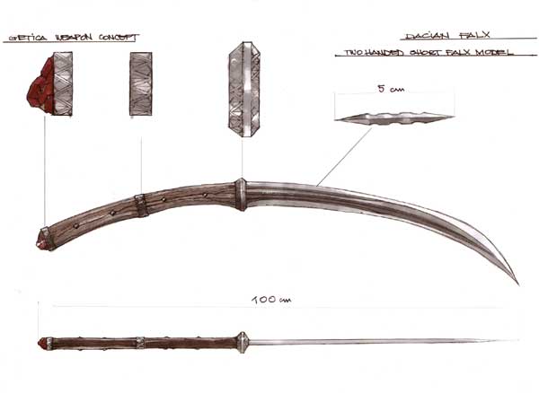 Falx es una palabra latina que significa “hoz” o “guadaña”, usada para referirse a estas herramientas agrícolas que ayudaban en la siega. Los dacios usaban largas hojas curvas parecidas a hoces o guadañas que les ayudaban con una cosecha bastante más truculenta: legionarios romanos.